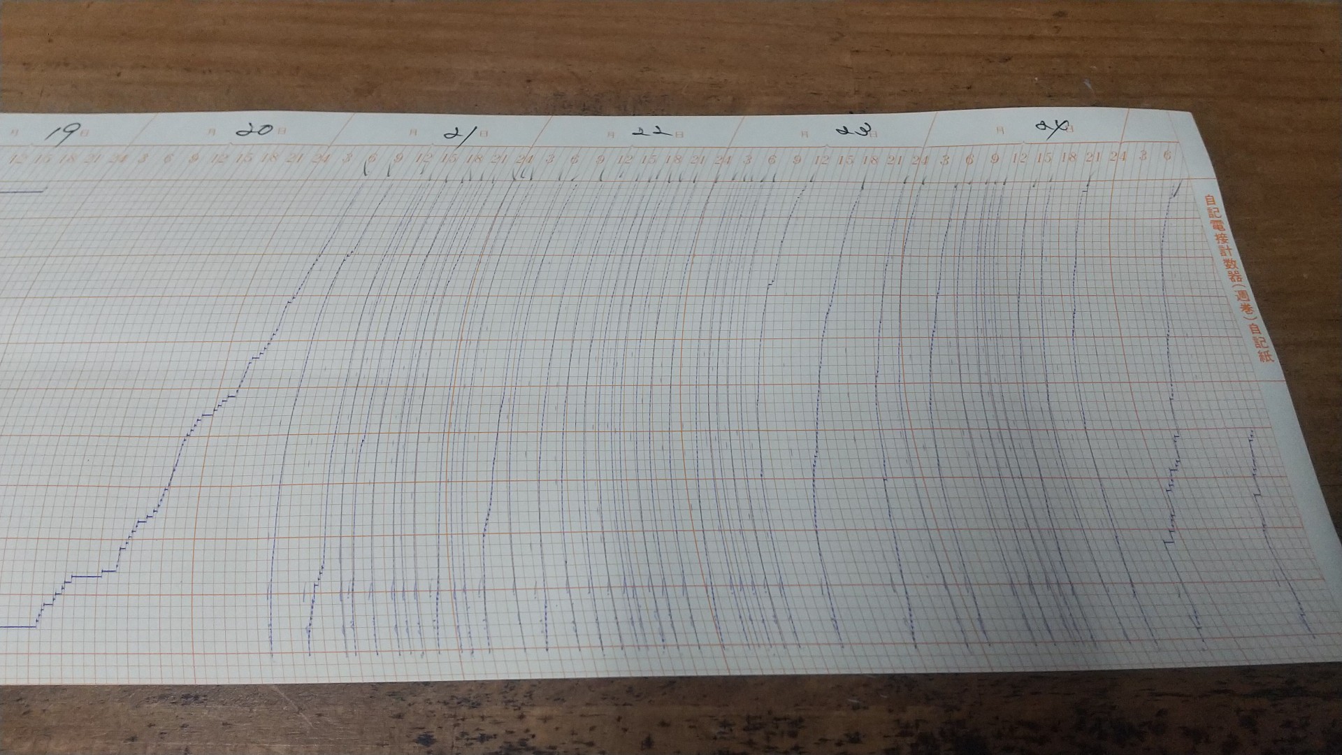(↑観測した雨量:横軸=日付(時間)、縦軸=雨量(50mm)/1本)