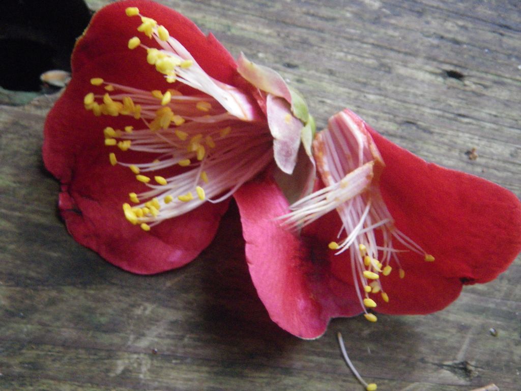 真下には、サルが食べ散らかした半分になったツバキがたくさん落ちていました。